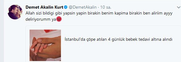 Demet Akalın ölüme terk edilen bebek için şu tweeti attı: “Allah sizi bildiği gibi yapsın. Yapın bırakın benim kapıma bırakın ben alırım ay deliriyorum ya.”