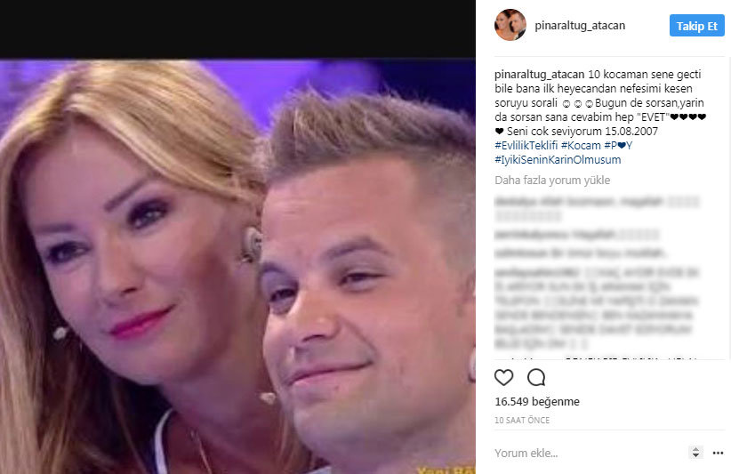 Eşiyle birlikte görüldüğü bir kareyi takipçileriyle paylaşan Altuğ, altına da şunları yazdı: "10 kocaman sene geçti bile bana ilk heyecandan nefesimi kesen soruyu soralı… Bugün de sorsan, yarın da sorsan sana cevabım hep EVET. Seni çok seviyorum 15.08.2007…"