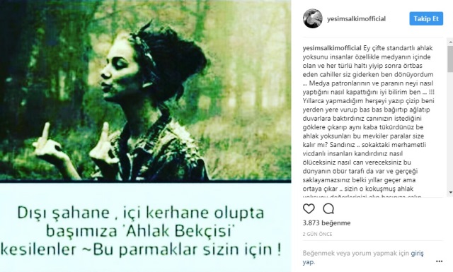 İşte Yeşim Salkım’ın üzeri kapalı bir şekilde Gülben Ergen’e göndermede bulunduğu o satırlar: “Ey çifte standartlı ahlak yoksunu insanlar özellikle medyanın içinde olan ve her türlü haltı yiyip sonra örtbas eden cahiller siz giderken ben dönüyordum … Medya patronlarının ve paranın neyi nasıl yaptığını nasıl kapattığını iyi bilirim ben! Yıllarca yapmadığım her şeyi yazıp çizip beni yerden yere vurup bas bas bağırtıp ağlatıp duvarlara baktırdınız canınızın istediğini göklere çıkarıp aynı kaba tükürdünüz be ahlak yoksunları… Bu mevkiler paralar size kalır mı sandınız? Sokaktaki merhametli, vicdanlı insanları kandırdınız nasıl öleceksiniz nasıl can vereceksiniz? Bu dünyanın öbür tarafı da var ve gerçeği saklayamazsınız belki yıllar geçer ama ortaya çıkar. Sizin o kokuşmuş ahlak yoksunu değerlerinizi alın başınıza çalın … Dediğim gibi ağzınızda yalan varken konuşmayın! Sizden korkan sizin gibi olsun bizim bir Allah’a can borcumuz var onu da o verdi o alır … Ben öyle süslü kelimelerle kendimi asilzade göstermem içimiz dışımız bir Allah biliyor siz bilmesenizde olur … YANACAKSINIZ”