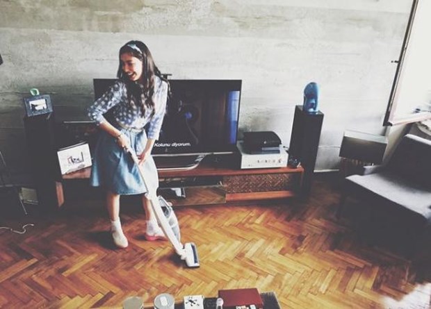23 yaşındaki Neslihan Atagül bu kez elinde elektrik süpürgesiyle ev süpürüyor.